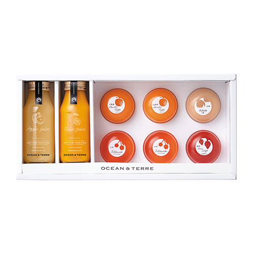 アップルジュース180ml×1、ミカンジュース180ml×1、北海道 赤肉メロンゼリー72g×2、山形県 さくらんぼゼリー72g×2、山梨県 白桃ゼリー72g×1、福岡県 あまおう苺ゼリー72g×1