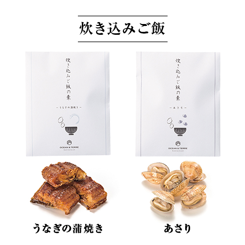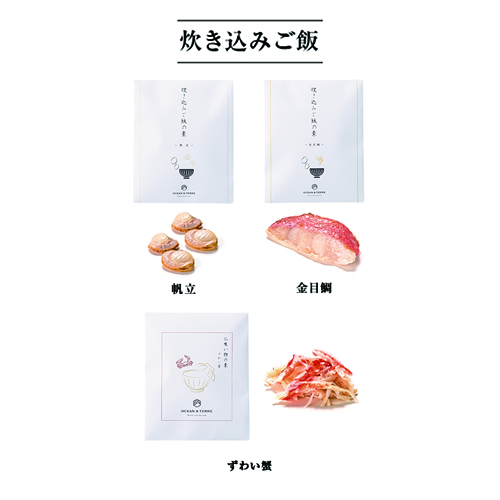 炊き込みご飯の素(2合用)×5、ずわい蟹13g×1、金目鯛1切×1、