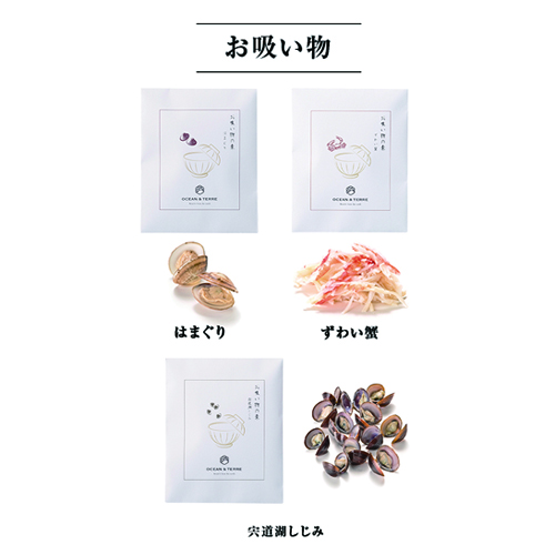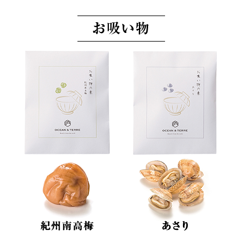 お吸い物の素×5、はまぐり2個×1、ずわい蟹13g×1、紀州南高梅1粒×1、