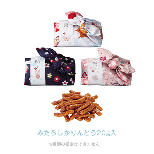 和婚を華やかに彩るデザイン。中身を食べ終わった後もハンカチとして使えます。●商品サイズ/100×70×35mm●ハンカチサイズ/280×280mm●賞味期限/30日●アレルゲン/小麦【セット内容】みたらしかりんとう20g入(※色の指定はできません。)