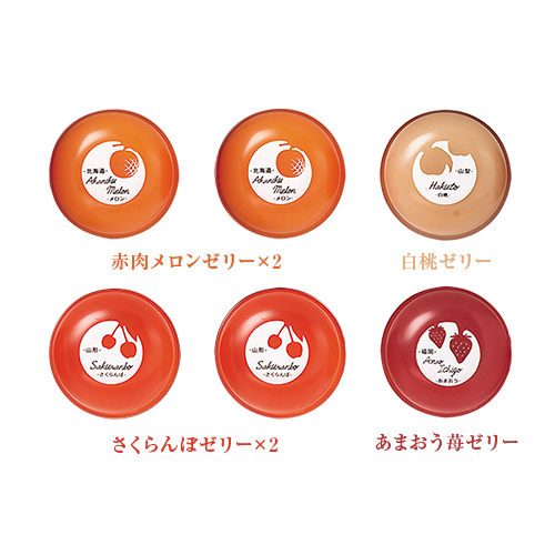 アップルジュース180ml×1、ミカンジュース180ml×1、北海道 赤肉メロンゼリー72g×2、山形県 さくらんぼゼリー72g×2、山梨県 白桃ゼリー72g×1、福岡県 あまおう苺ゼリー72g×1