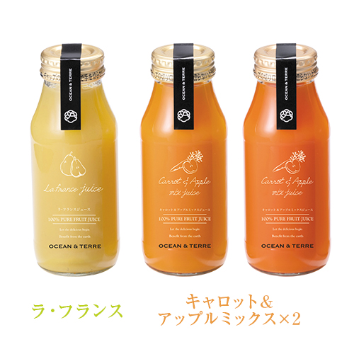 キャロット&アップルミックスジュース180ml×2、ラ・フランスジュース180ml×1