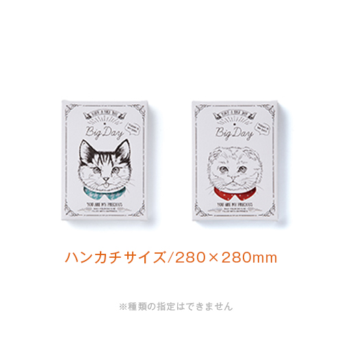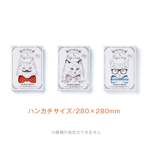 人気の猫柄に遊び心をくわえたハンカチギフトオシャレアイテムがギフトに!●商品サイズ/80×110×15mm●ハンカチサイズ/280×280mm(※種類の指定はできません)【セット内容】ハンカチ1枚入
