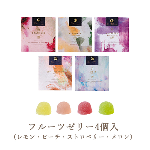 5種類の色鮮やかでアーティスティックなペイントは、バラやチューリップなどお花をイメージしたデザイン。文字のきらりとした光沢が、高級感を演出します。●商品サイズ/82×82×30mm●賞味期限/30日●アレルゲン/なし【セット内容】フルーツゼリー4個入(レモン・ピーチ・ストロベリー・メロン)(※種類の指定はできません。)