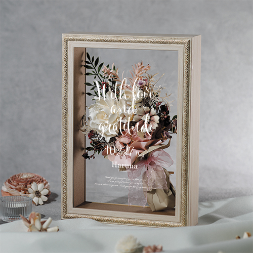 手作りで届ける、永遠の美しさ。誓いの瞬間を閉じ込めて、式後も親御様の元で咲き続けるブーケ。