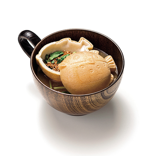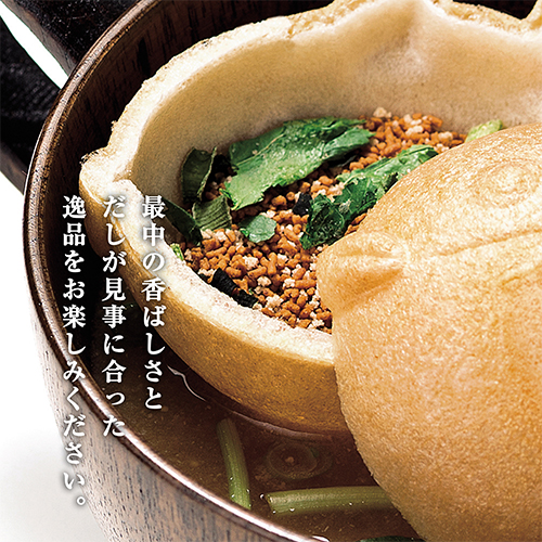 だし味噌汁を、もちもちの最中の中に閉じ込めました。風味と食感をお楽しみください。